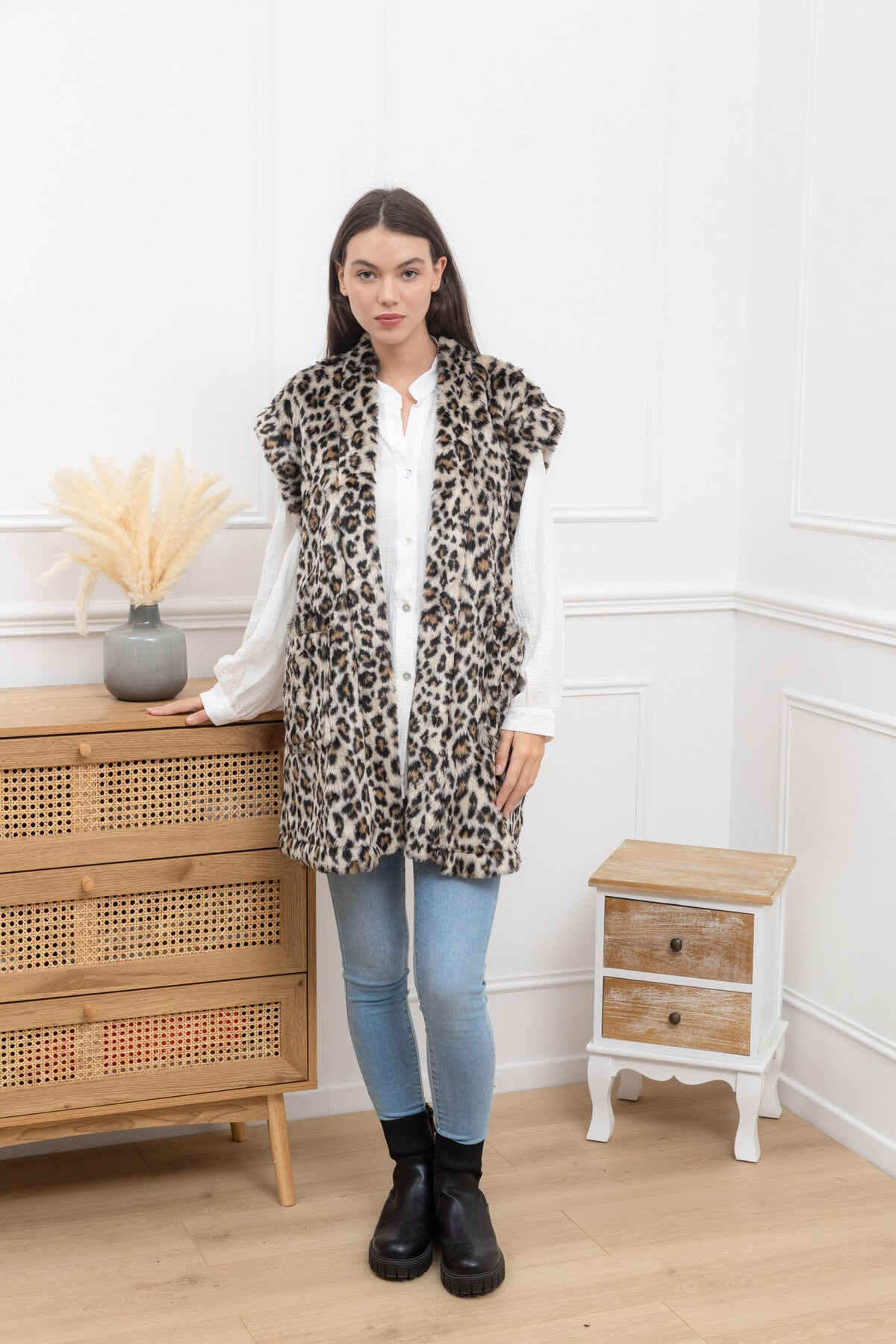 Gilet sans manche en fausse fourrure léopard