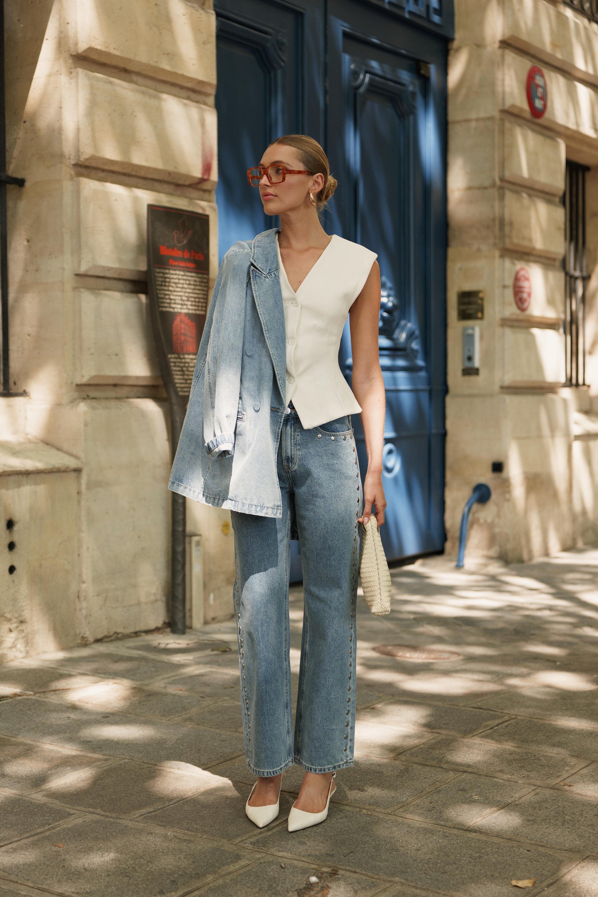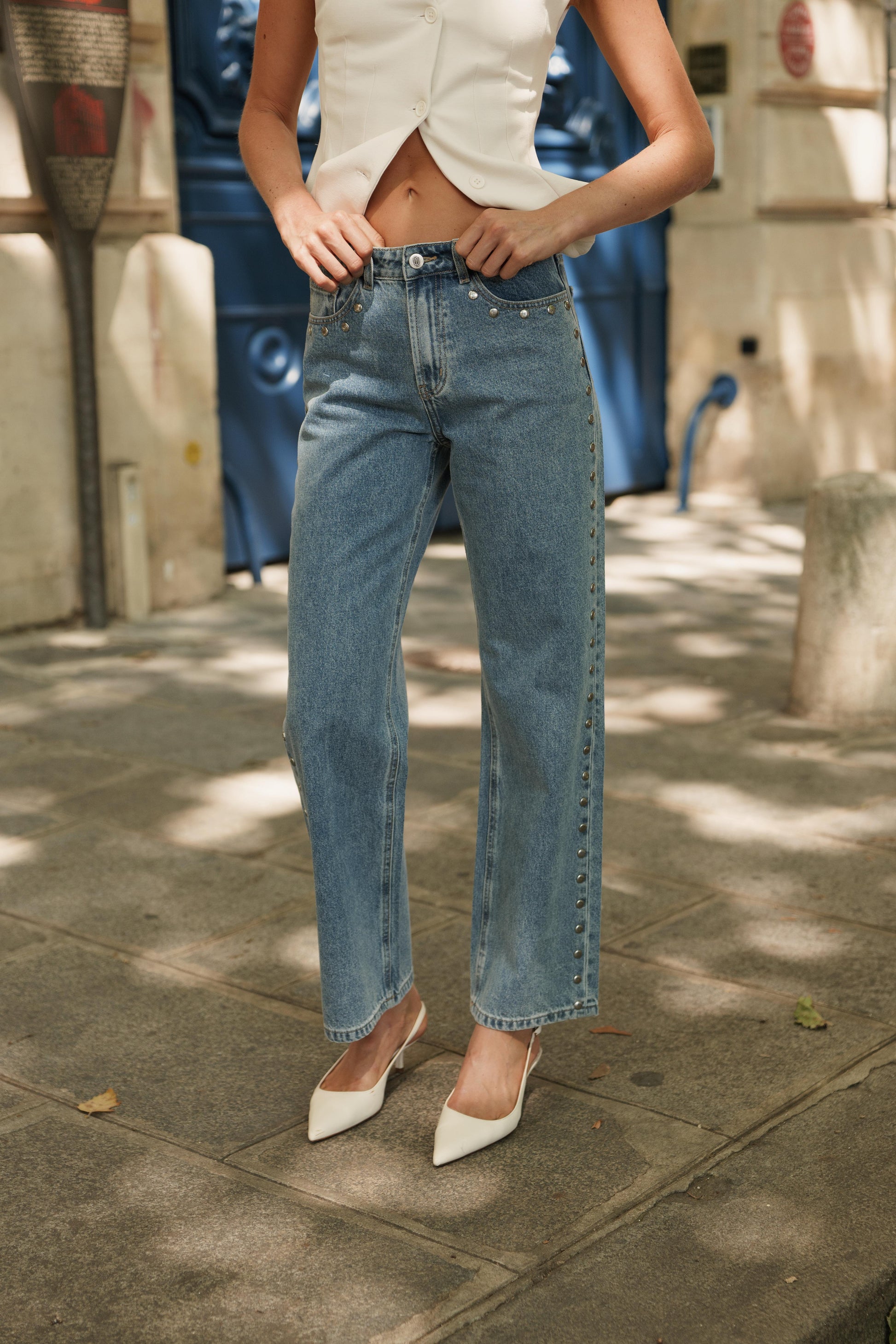 Un jean droit twisté par de jolis détails cloutés sur les côtés.